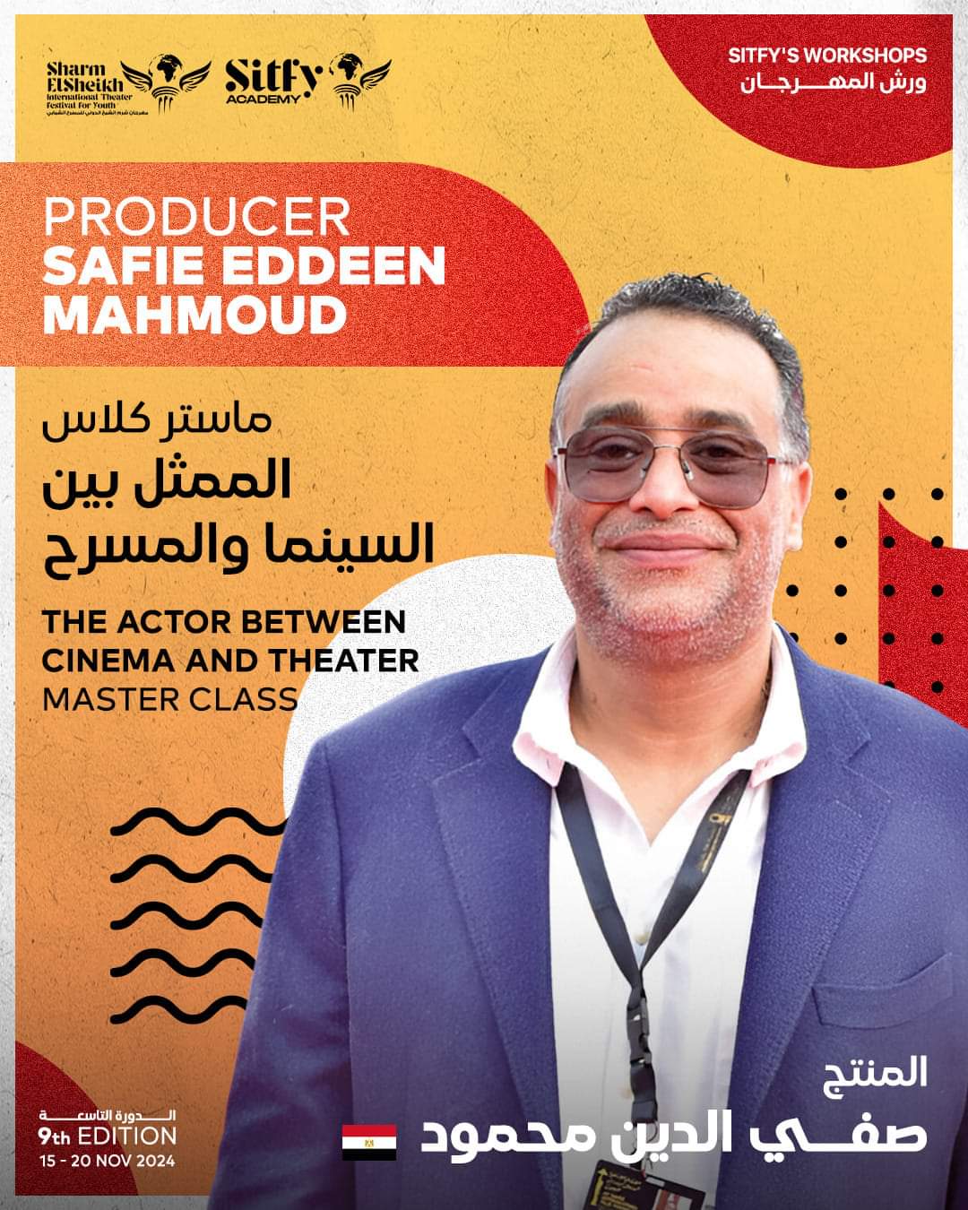 ويقدم المخرج والمنتج المصري صفي الدين محمود ماستر كلاس بعنوان ( الممثل بين السينما والمسرح ) ، لينقل خبرته كمخرج ومنتج للشباب المشارك في المهرجان وللمهتمين من الفنانين بمدينة شرم الشيخ، وصفي الدين منتج مصري، وعمل كمساعد مخرج مع كبار مخرجي السينما المصرية ومن الأفلام التي ساعد في اخراجها (أسرار البنات) ، (أحلى الأوقات) ، (محامي خلع)، وعمل مع المخرج مروان حامد في عدة أفلام آخرها (الفيل الأزرق)، واتجه للإنتاج وأنتج عدة أعمال قيمة مثل (الأصليين) و(فوتوكوبي) و( نوارة ) .