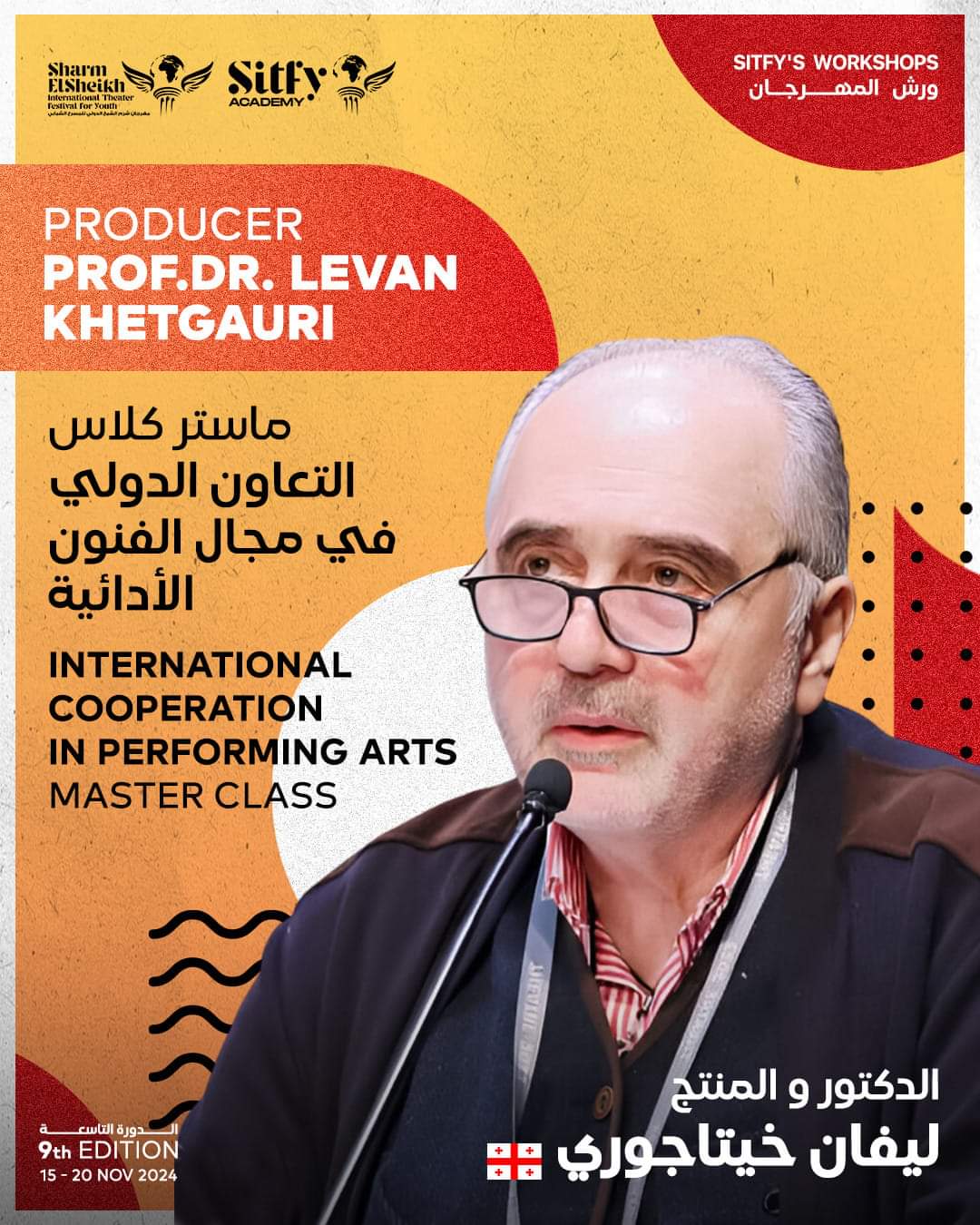 ويقدم المدرب د. ليفان خيتاجوري رئيس الهيئة الدولية للمسرح بجورجيا ماستر كلاس بعنوان "التعاون الدولي في مجال الفنون الأدائية"، و خيتاجوري هو الرئيس السابق لمجلس مستشاري برنامج الشراكة لأوروبا الشرقية، وخبير دولي في الدراسات المسرحية والتعليم العالي للفنون .