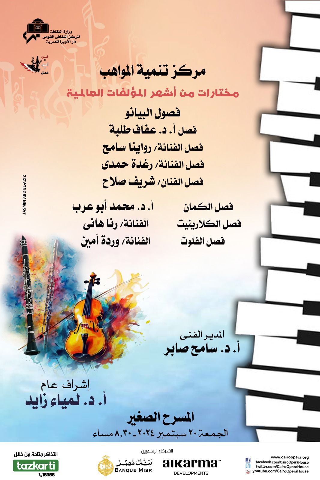 تقدم دار الأوبرا برئاسة الدكتورة لمياء زايد، حفلا لطلاب ٧ فصول بمركز تنمية المواهب للعزف على ألآت ( البيانو- الكمان- الكلارينيت- الفلوت) تحت إشراف المدير الفني الدكتور سامح صابر، وذلك في الثامنة والنصف مساء اليوم، الجمعة، علي المسرح الصغير، وذلك في إطار اهتمام الثقافة المصرية بدعم المواهب وتشجيعها.