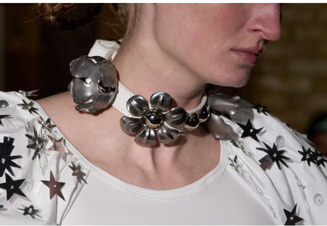 ونتحدث عن القلادات التشوكر التي ازدانت هذا العام بتفاصيل معدنية زادتها تفرداً، من جهتنا أحببنا القلادة الجلد البيضاء المزينة بالورود الفضية الكبيرة من مجموعة ماركة تشوبوفا لوينا Chopova Lowena، وننصحك بتنسيقها مع جمبسوت أبيض V Neck، وتممي أناقتك بحذاء فضي، وحقيبة بلون صيفي مميز، كما يمكنك ارتداؤها مع بلوزة بيضاء بياقة دائرية واسعة وجينز أزرق.