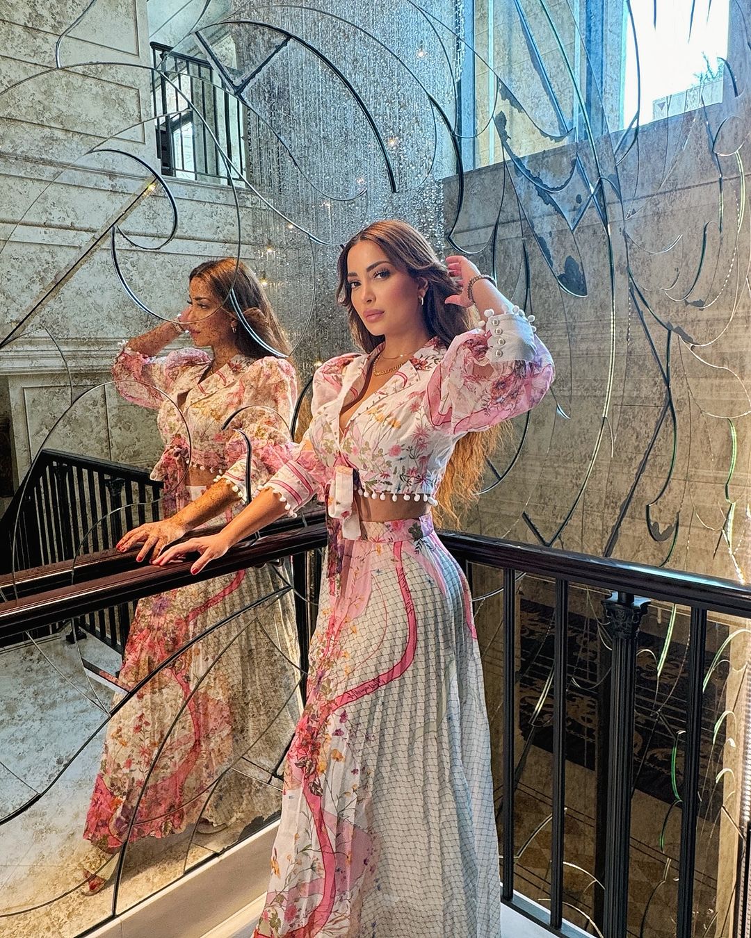 وظهرت نسرين بإطلالة أنيقة وبسيطة حيث ارتدت جيب منفوش باللون الأبيض والروز ونسقت معه توب قصير بنفس الألوان أبرز خصرها الممشوق ، أما من الناحية الجمالية اختارت طافش لوك بسيط يبرز ملامحها الجذابة ، وتركت خصلات شعرها البني الطويل منسدلًا على كتفيها بإنسيابية ونعومة .