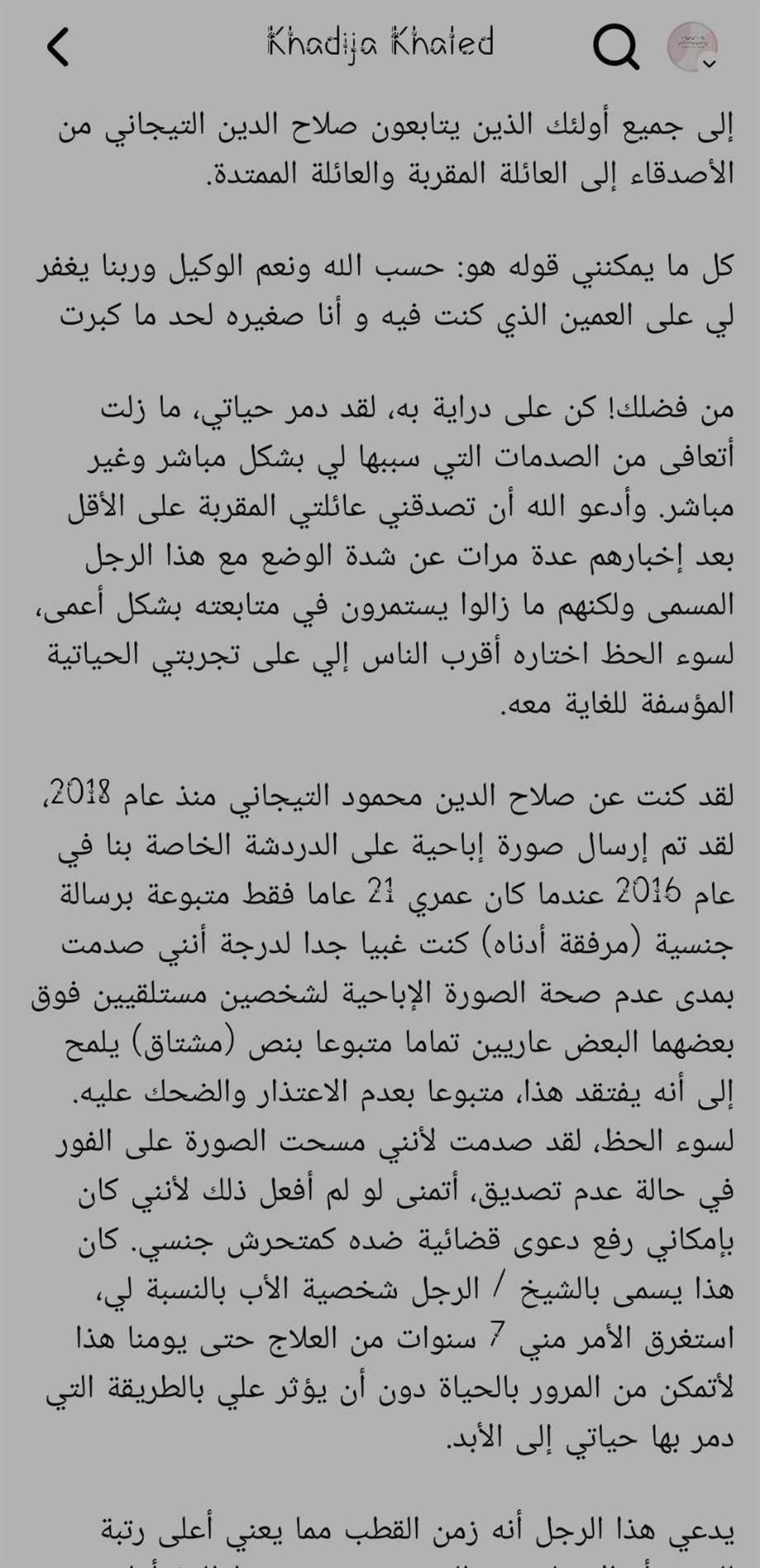 كما أعلن المجلس القومي للمرأة، أمس الخميس، تقدمه ببلاغ للنائب العام ضد الشيخ التيجاني، عقب رصد مكتب شكاوى المرأة بالمجلس منشور فتاة تسرد تفاصيل تعرضها لانتهاكات جنسية من الشيخ المشكو في حقه، علاوة على منشورات مماثلة لثلاث فتيات ضد نفس الشخص على مواقع التواصل الاجتماعي.