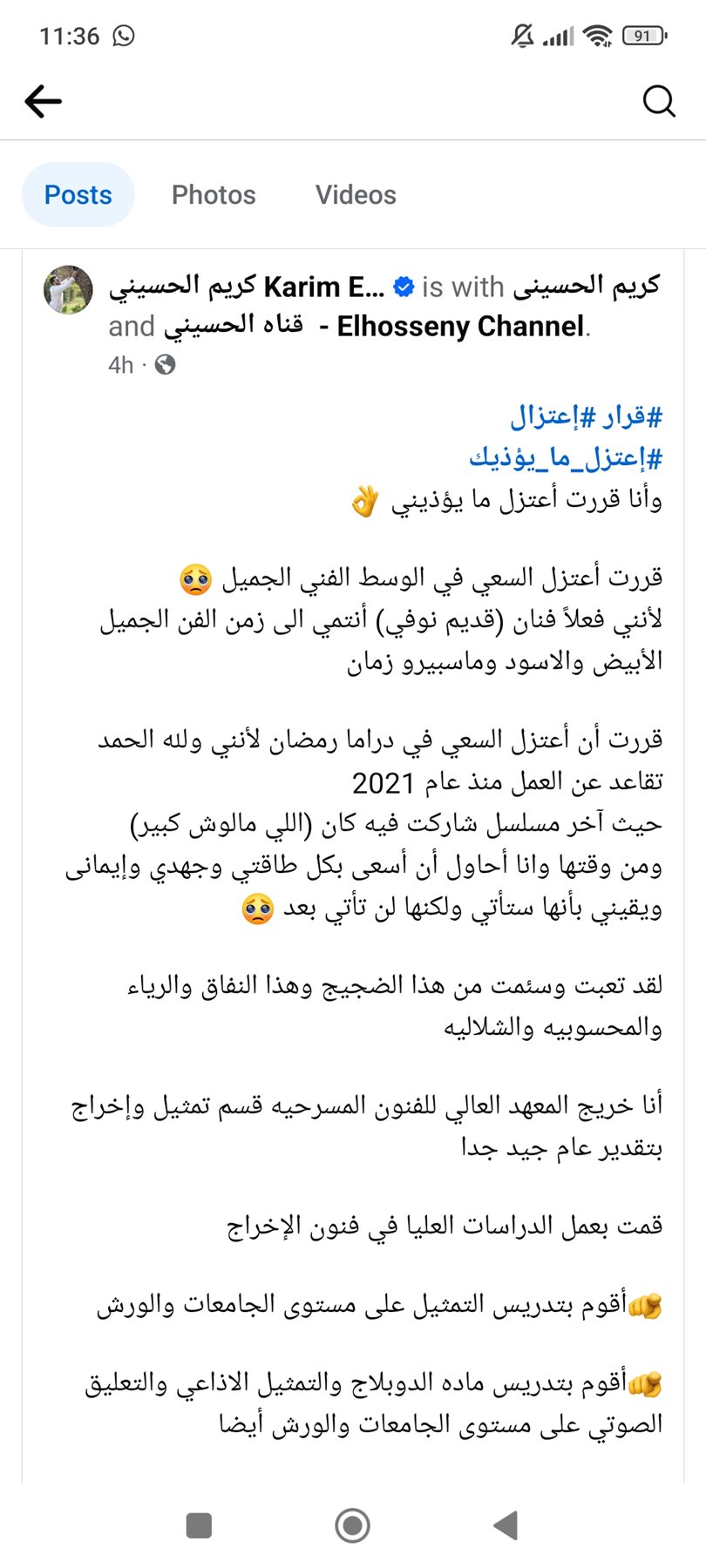 وكتب الحسيني، عبر صفحته قائلًا : "قررت أعتزل السعي في الوسط الفني الجميل