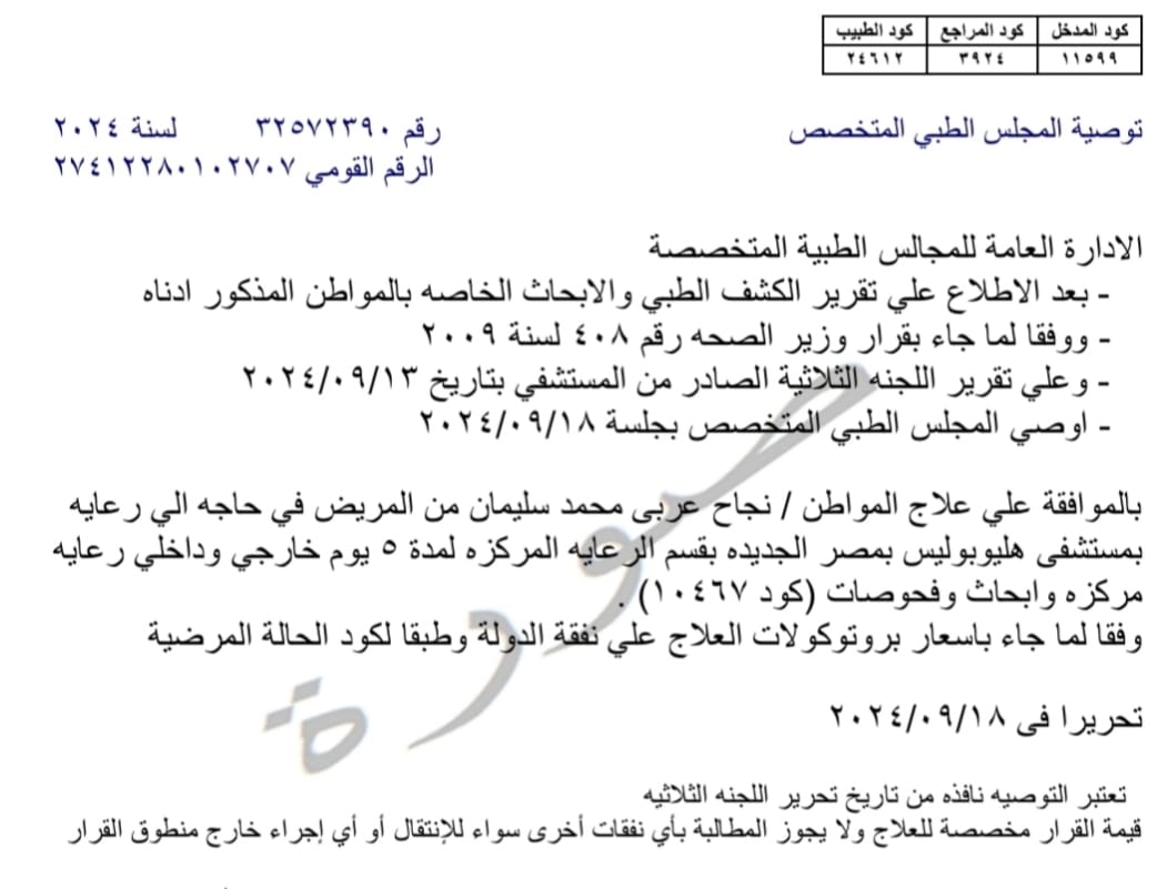 وخالفت ادارة المستشفى توجيهات وزير الصحة وتجاهلت قرار مجلس الوزارء بتقديم الخدمة الطبية اللازمة للحالات الطارئة لمدة 48 ساعه بالمجان والعمل على صدور قرار لها وعلى الرغم من تحصيل إدارة المستشفى مستحقاتها بصدور قرار علاج على نفقة الدولة لمدة الرعاية المركزه تمتنع إدارة المستشفى من رد الأموال المدفوعه للمستشفى.