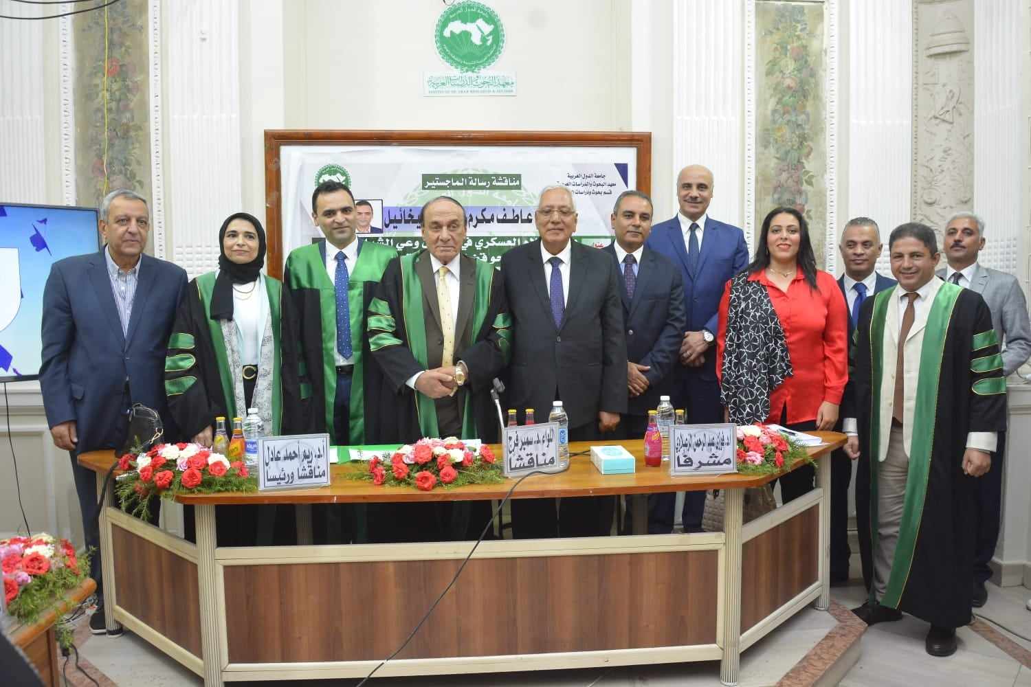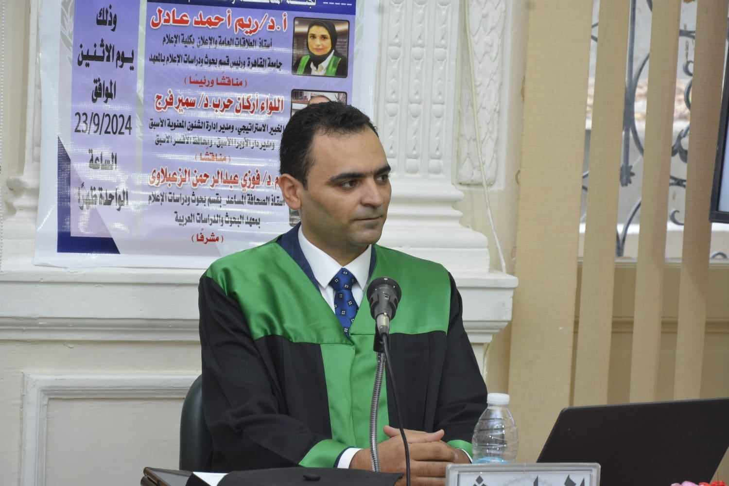 عقدت لجنة المناقشة والحكم برئاسة اللواء دكتور سمير فرج، الخبير الاستراتيجي ومدير إدارة الشئون المعنوية الأسبق، الأستاذ الدكتور ريم أحمد عادل، أستاذ العلاقات العامة بكلية الإعلام جامعة القاهرة ورئيس قسم بحوث ودراسات الإعلام بمعهد البحوث والدراسات العربية، والأستاذ الدكتور فوزي عبد الرحمن، أستاذ الصحافة المساعد بمعهد البحوث والدراسات العربية.