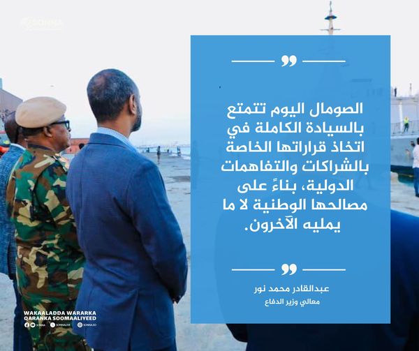 قال عبد القادر محمد نور، وزير الدفاع الصومالي، إن مقديشو اليوم تتمتع بالسيادة الكاملة في اتخاذ قراراتها الخاصة بالشراكات والتفاهمات الدولية، بناءً على مصالحها الوطنية، لا ما يمليه الآخرون".