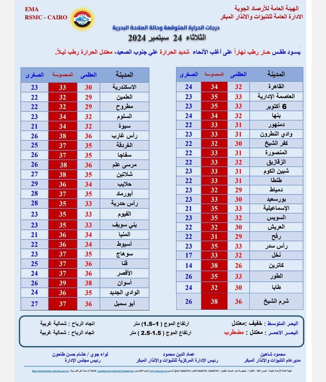 يشهد اليوم الثلاثاء الموافق 24 سبتمبر، طقس حار رطب نهاراً على أغلب المحافظات، شديد الحرارة على جنوب الصعيد، وفي الليل يسود طقس معتدل الحرارة رطب.