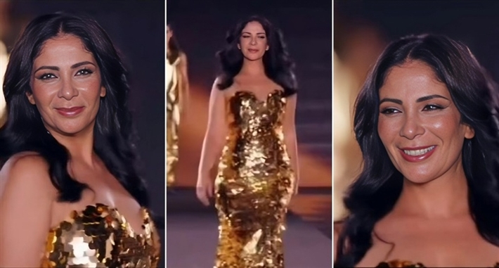 وارتدت النجمة المصرية فستان بدون أكمام مجسم باللون الذهبي اللامع وهو ما أبرز قوامها الممشوق، أما من الناحية الجمالية اختارت عدم التكلف وتركت شعرها منسدلًا على كتفيها بنعومة وانسيابية، مع وضع مكياج هادئ متناغم مع الإطلالة.