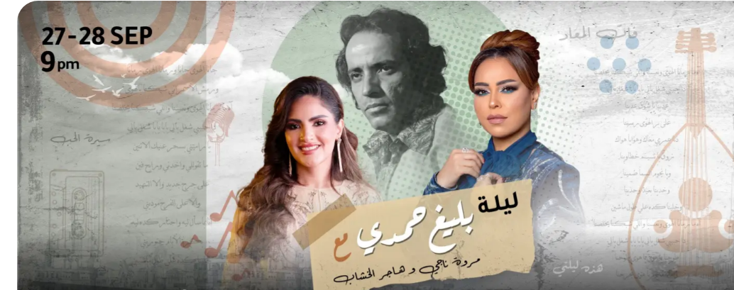 في ليلة من زمن الفن الجميل يقدم كل من الفنان مروة ناجي والفنانة هاجر الخشاب، أمسية مع ألحان الكبير بليغ حمدي في السعودية.