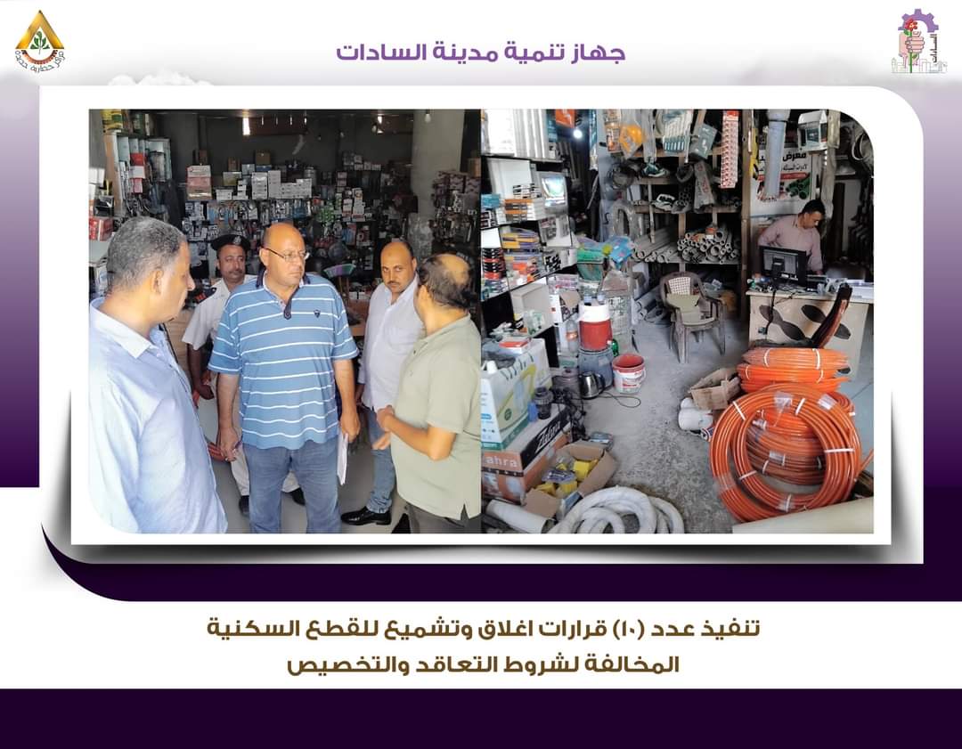 قامت اليوم حملة مكبرة من إدارة التنمية، وإدارة الأمن، والعلاقات العامة والإعلام، وشرطة التعمير، بتنفيذ عدد (10) قرارات غلق وتشميع للقطع السكنية المخالفة لشروط التعاقد والتخصيص بمختلف أنحاء مدينة السادات .