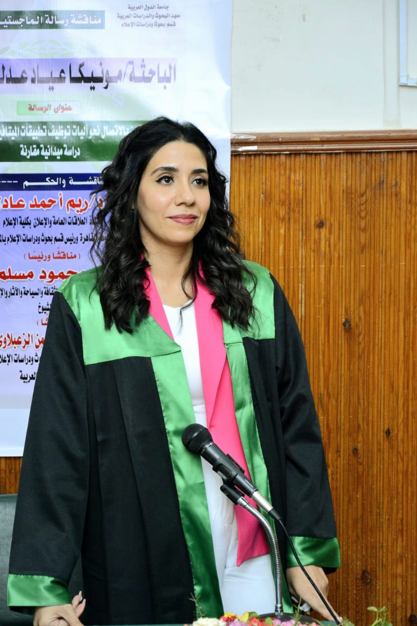 تناولت رسالتها "توجهات القائمين بالاتصال نحو آليات توظيف تطبيقات الميتافيرس في غرف الأخبار العربية"، وقد أشرف عليها د. فوزي عبد الرحمن الزعبلاوي، أستاذ الصحافة المساعد بمعهد البحوث والدراسات الإعلامية.