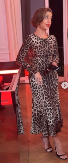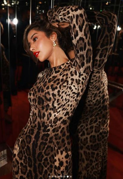وبدت بلقيس فتحي بإطلالة جذابة، مفعمة بالأنوثة والجرأة النابعة من ذوقها الرفيع، حيث ارتدت فستانًا طويلًا مجسمًا، ذا أكمام طويلة، صمم من قماش ناعم بنقشه التايجر، فيما انتعلت صندلًا بكعب عال.
