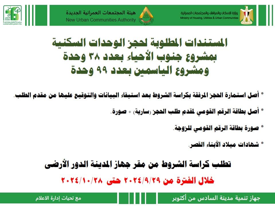أعلن جهاز تنمية مدينة السادس من أكتوبر، عن المستندات المطلوبة لحجز الوحدات السكنية المطروحة بمشروع جنوب الأحياء بعدد ٣٨ وحدة، ومشروع الياسمين بعدد 99 وحدة.