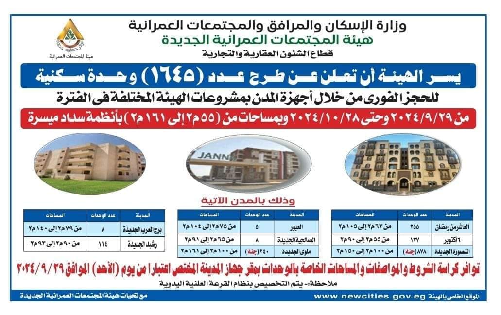وتبدأ وزارة الإسكان، ممثلة فى أجهزة المدن طرح 1645 وحدة سكنية متنوعة بمساحات تصل إلى 161 مترا، بأنظمة سداد ميسرة للحجز الفوري.