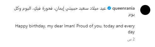وعبرت الملكة الأردنية عن فخرها بإبنتها معلقة على الصورة قائلة: "عيد ميلاد سعيد حبيبتي إيمان، فخورة بك، اليوم، وكل يوم".