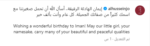 ووصف الأمير الحسين شقيقته بالهادئة والرقيقة، متمنيًا لها الخير، حيث كتب في تدوينةٍ شاركها عبر حسابه الرسمي على موقع تبادل الصور والفيديوهات الأشهر انستجرام: إيمان الهادئة الرقيقة.. أسأل الله أن تحمل صغيرتنا، مع اسمك، كثيرًا من صفاتك الجميلة، كل عام وأنتِ بألف خير.
