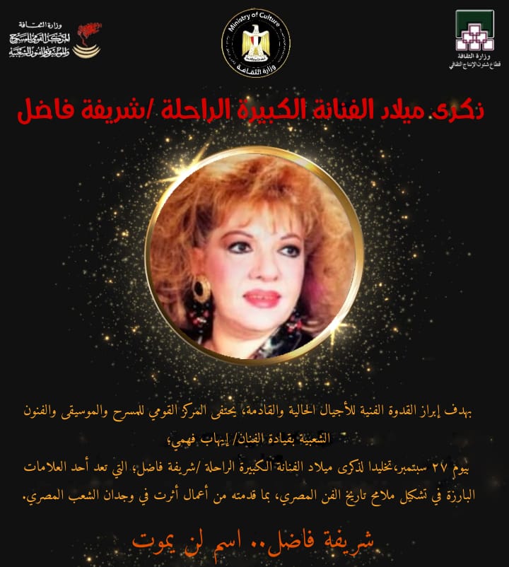 ويأتي إحياء ذكراها بهدف إبراز القدوة الفنية للأجيال الحالية والقادمة، وذلك تخليدًا لذكرى ميلاد الفنانة الكبيرة شريفة فاضل، وتعد هي أحد العلامات البارزة في تشكيل ملامح الفن المصري، بما قدمته من أعمال أثرت في وجدان الشعب المصري.