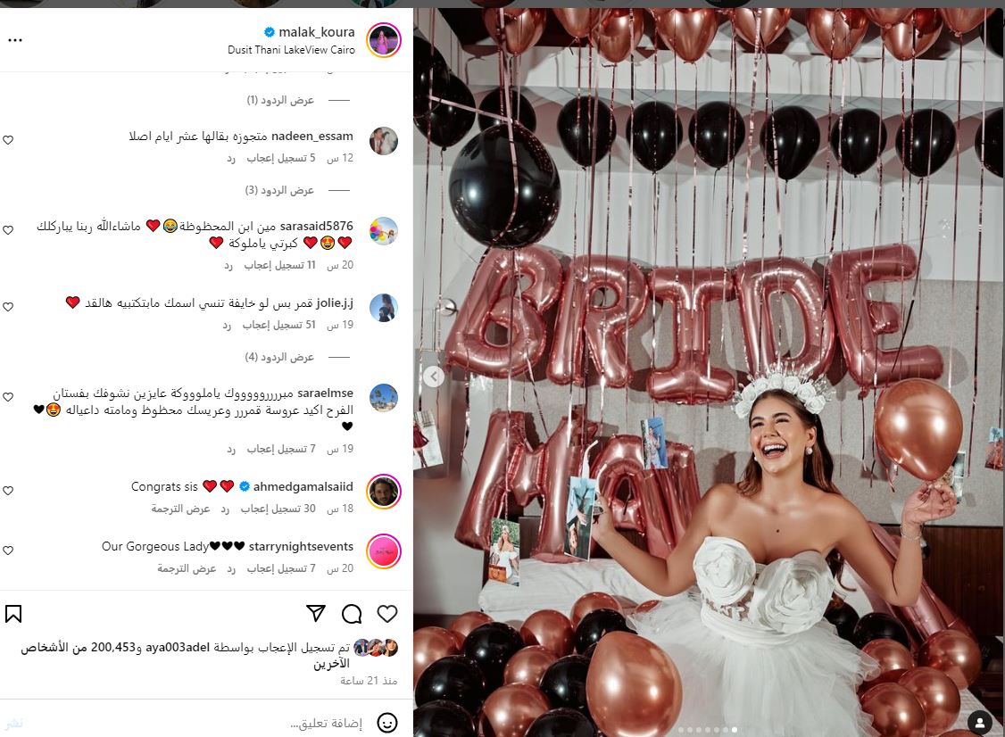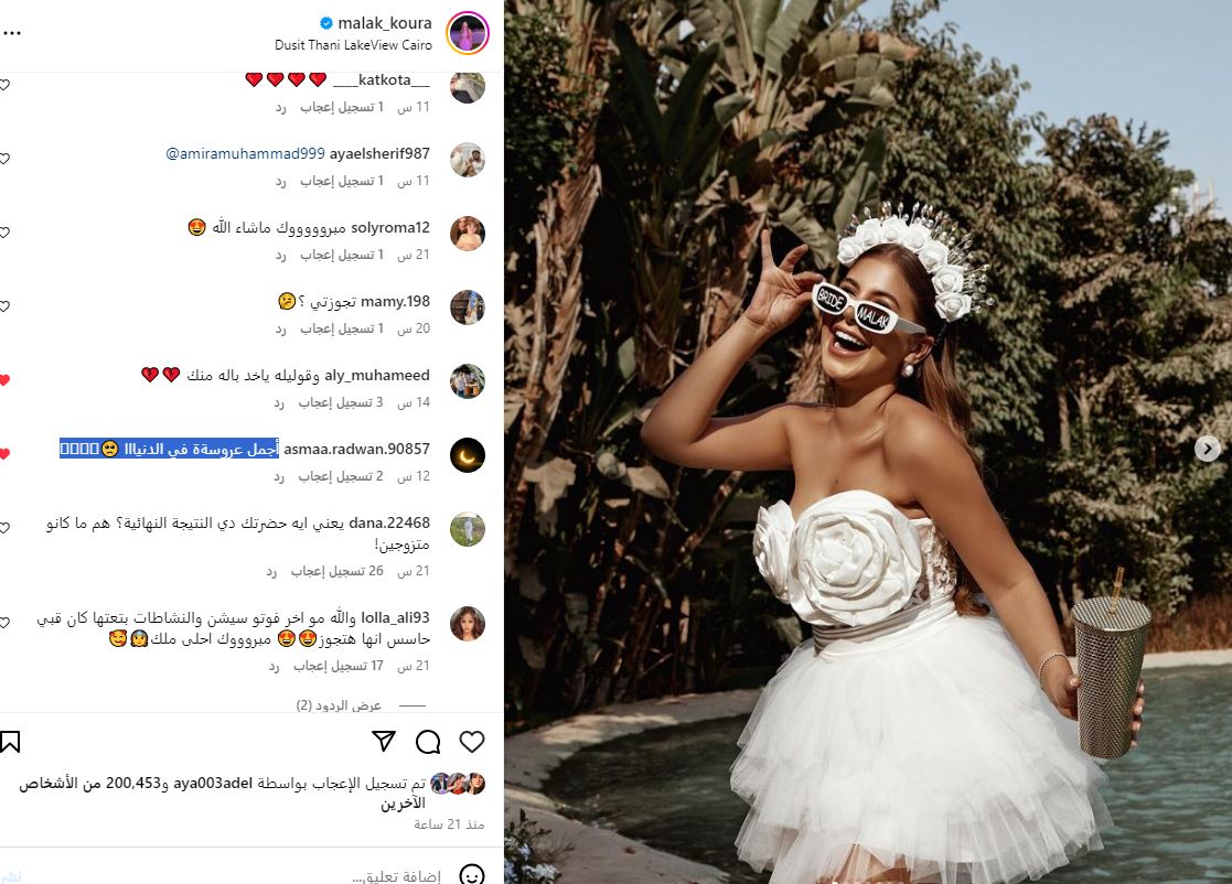 وانهالت التعليقات والمباركات على صور التي اوهيت لهم انها تستعد لدخول عش الزوجية، وجاءت أبرز التعليقات مليئة بمشاعر الحب والفرحه لها، رصدنا أبرزها: " مبروك ياملوكة عايزين نشوفك بفستان الفرح اكيد عروسة قمررر وعريسك محظوظ ومامته داعياله، امورتي الحلوة بقت طعمة ولها سحر جديد، وقوليله ياخد باله منك، أجمل عروسة في الدنيا، اكثر فنانه جنن وتستاهل تزوج".