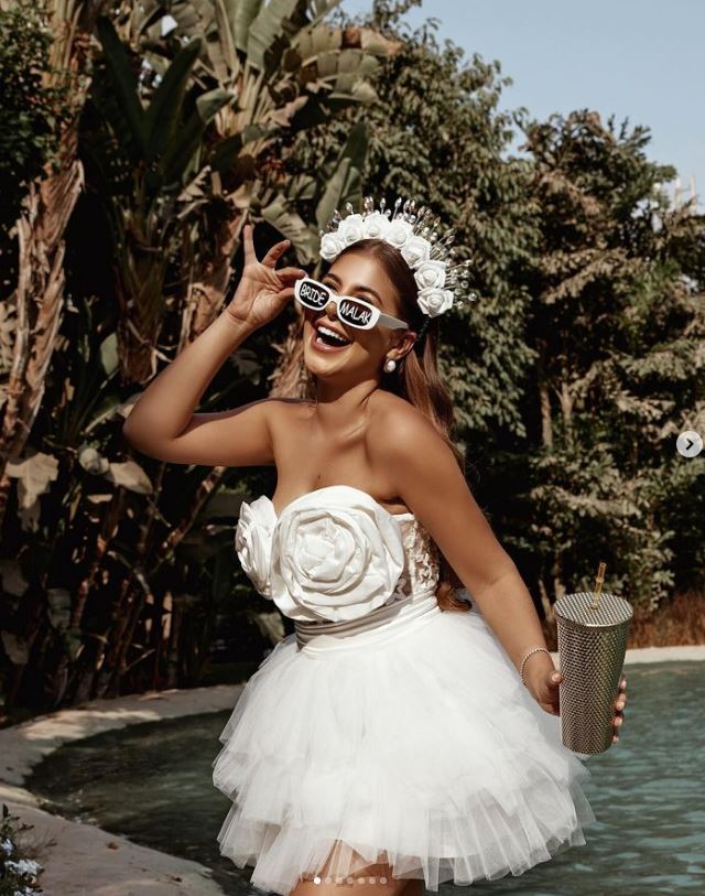 وظهرت ملك قورة بإطلالة بيضاء لافته، حيث ارتدت فستان قصير مجسم، مزين بالزهور، صمم من قماش الساتان والحرير الناعم يشبه في تصميمه فساتين الزفاف الجريئة.