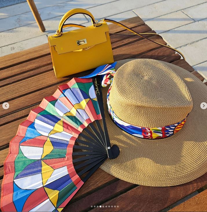 واختارت ترك خصلات شعرها وراء ظهرها على طريقة الويفي الواسع وزينته بقبعة صممت من الخوص ووضعت مكياجًا ناعمًا مرتكزًا على الألوان الترابية مع تحديد عينيها بالكحل والماسكرا السوداء ولون البينك في الشفاه.