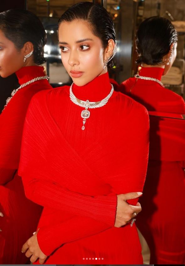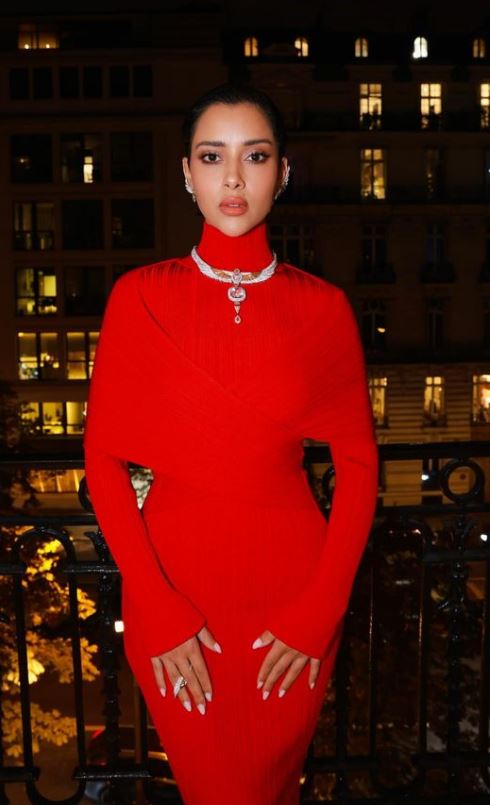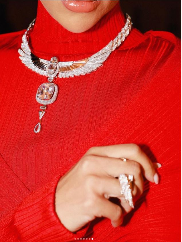 وتزينت بعقد بشكل فرعوني مجوهرات مرصعه بالألماس لتزيد من فخامة إطلالتها.