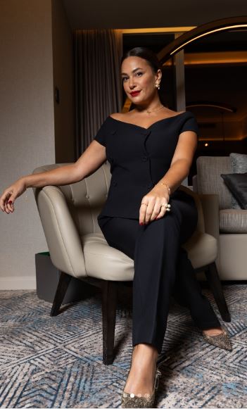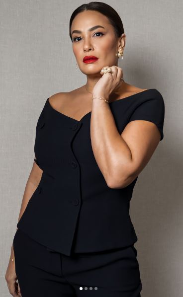 واختارت لم خصلات شعرها للوراء ووضعت لمسات ناعمة من المكياج المرتكز على الألوان الترابية مع تحديد عينيها بالكحل والماسكرا السوداء ولون الأحمر الصارخ في الشفاه.