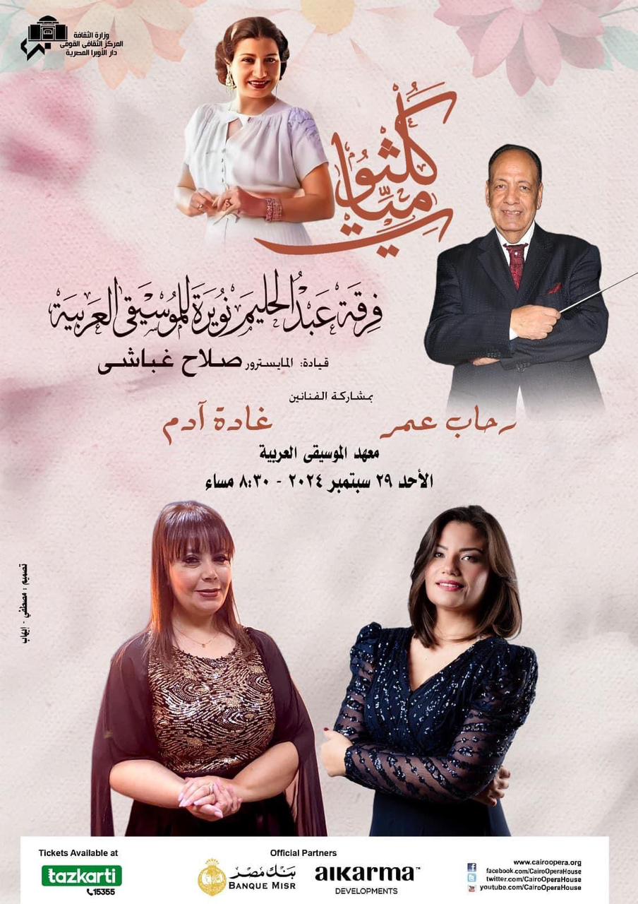 تواصل وزارة الثقافة المصرية تقديم روائع وإبداعات رموز الغناء العربي من خلال دار الأوبرا المصرية برئاسة الدكتورة لمياء زايد، عبر حفل ضمن سلسلة "كلثوميات" التي تقدمها فرقة عبد الحليم نويرة للموسيقى العربية بقيادة المايسترو صلاح غباشي، وذلك في الثامنة والنصف مساء الأحد ٢٩ سبتمبر على مسرح معهد الموسيقى العربية.