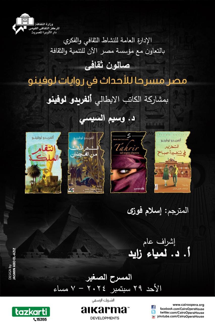 تنظم وزارة الثقافة المصرية، في إطار اهتمامها بتقديم أرقى الفنون من خلال دار الأوبرا المصرية برئاسة الدكتورة لمياء زايد، وضمن نشاطها الثقافي والفكري، وبالتعاون مع مؤسسة مصر الآن للتنمية والثقافة، صالونًا ثقافيًا بعنوان "مصر مسرحًا للأحداث في روايات لوفينو" فى السابعة مساء الأحد ٢٩ سبتمبر على المسرح الصغير.
