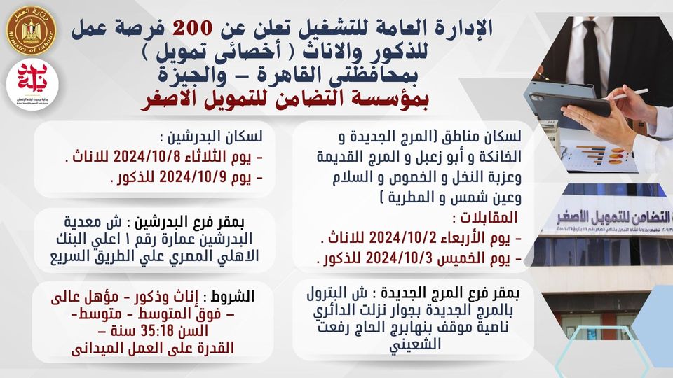 أوضحت الوزارة أن فرص العمل المتوفرة في مجال "أخصائي تمويل "، وذلك داخل مؤسسة التضامن للتمويل الأصغر لسكان مناطق:- المرج الجديدة والخانكة وابو زعبل والمرج القديمة وعزبة النخل والخصوص والسلام وعين شمس والمطرية والبدرشين.