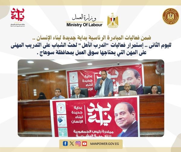 نظمت مديرية العمل بمحافظة سوهاج ، فعاليات ندوة توعية ضمن فعاليات "اتدرب اتأهل" لليوم الثاني ، والتى تهدف إلى نشر الوعي وإلقاء الضوء على أهمية الفرص التدريبية المجانية التي توفرها مديرية العمل للشباب من خلال مراكز التدريب المهني الثابتة والوحدات التدريبية المتنقلة التابعة لها والمنتشرة في مراكز المحافظة وذلك لتدريبهم وتأهيلهم على المهن التي يحتاجها سوق العمل الداخلي والخارجي.