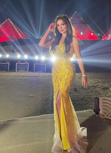 وبدت نسرين طافش بإطلالة ساحرة، مزجت بين الأنوثة والجاذبية في آن واحد، حيث ارتدت فستانا طويلا مجسما، بدون أكمام، اتسم بشق كشف عن أحد ساقيها، صمم من الفستان من قماش الكريب باللون الأصفر مطرز بحبات الخرز والكريستال، الفستان حمل توقيع علامة Mambo Couture.