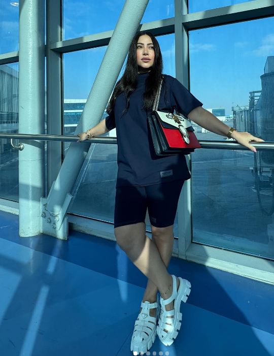 وبدت بوسي بإطلالة رياضية، حيث ارتدت تي شيرت ينتمى صيحة الأوفر سايز ونسقت عليه هوت شورت صمم من قماش اللاميه باللون الأسود، فيما انتعلت صندلًا بكعب عال.