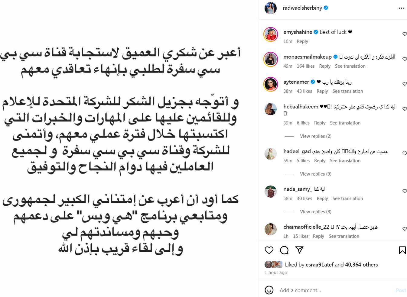 - سبب إنهاء تعاقد رضوى الشربيني مع CBC