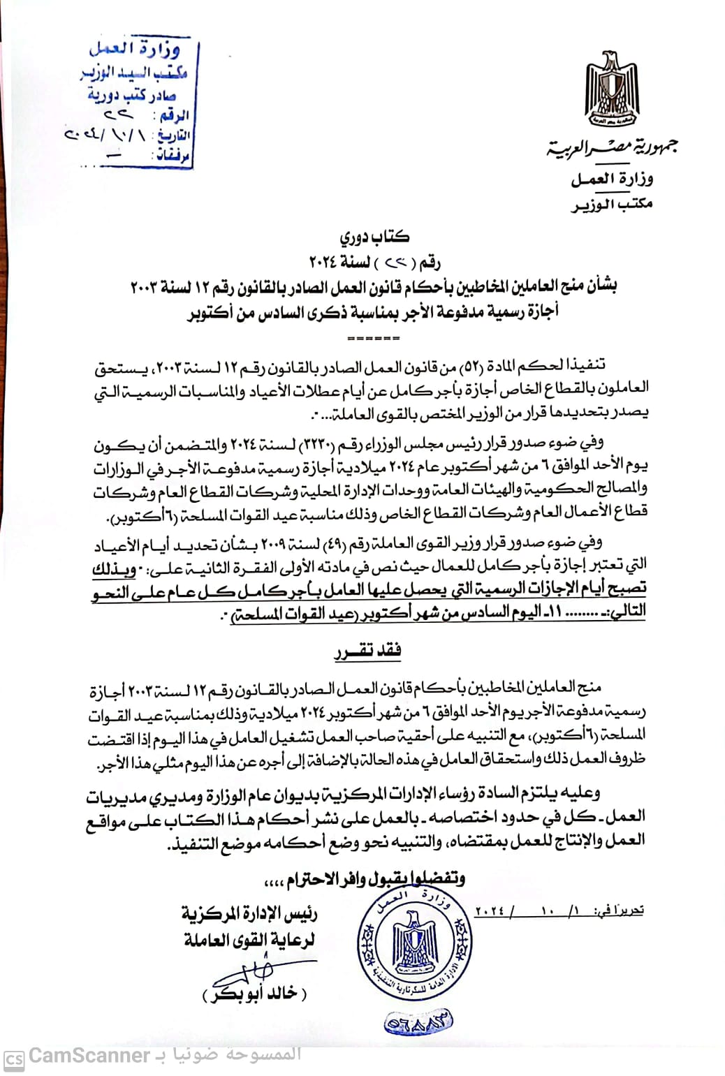 وذلك في إطار صدور قرار رئيس مجلس الوزراء رقم 3230 لسنة 2024، والمُتضمن أن يكون الأحد الموافق 6 من شهر أكتوبر عام 2024 إجازة رسمية مدفوعة الأجر للعاملين في الوزارات والمصالح الحكومية، والهيئات العامة، ووحدات الإدارة المحلية، وشركات القطاع العام وقطاع الأعمال العام، والقطاع الخاص، وذلك بمناسبة ذكرى انتصارات أكتوبر 1973.
