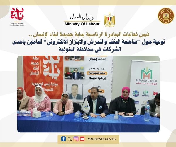 وزارة العمل توعي بمناهضة العنف والتحرش والابتزاز الالكتروني لعمال المنوفية