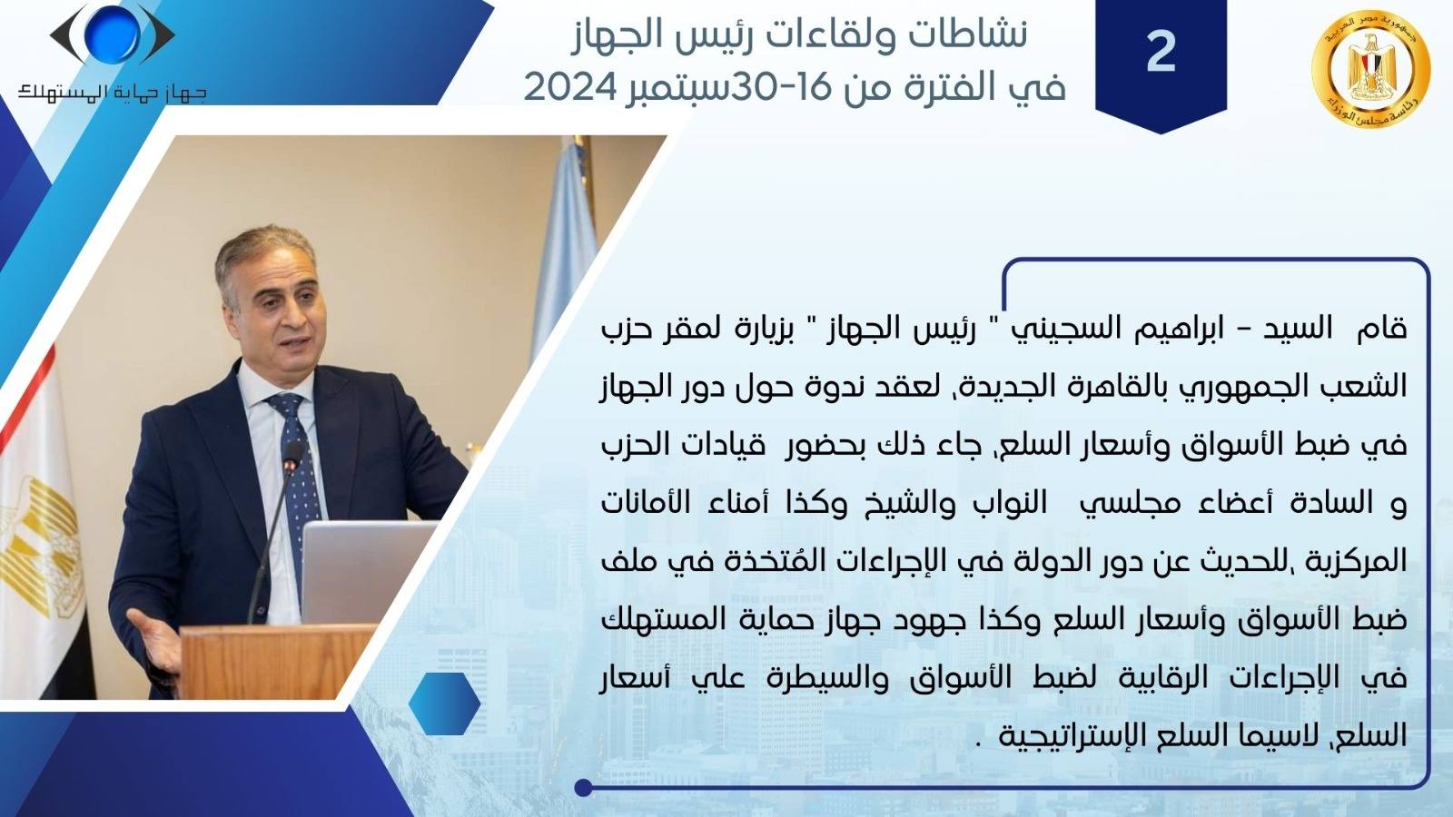 2 – قام إبراهيم السجيني رئيس الجهاز " بزيارة لمقر حزب الشعب الجمهوري بالقاهرة الجديدة، لعقد ندوة حول دور الجهاز في ضبط الأسواق وأسعار السلع، جاء ذلك بحضور قيادات الحزب و السادة أعضاء مجلسي النواب والشيخ وكذا أمناء الأمانات المركزية ،للحديث عن دور الدولة في الإجراءات المُتخذة في ملف ضبط الأسواق وأسعار السلع، وكذا جهود جهاز حماية المستهلك في الإجراءات الرقابية لضبط الأسواق والسيطرة علي أسعار السلع، لاسيما السلع الإستراتيجية .