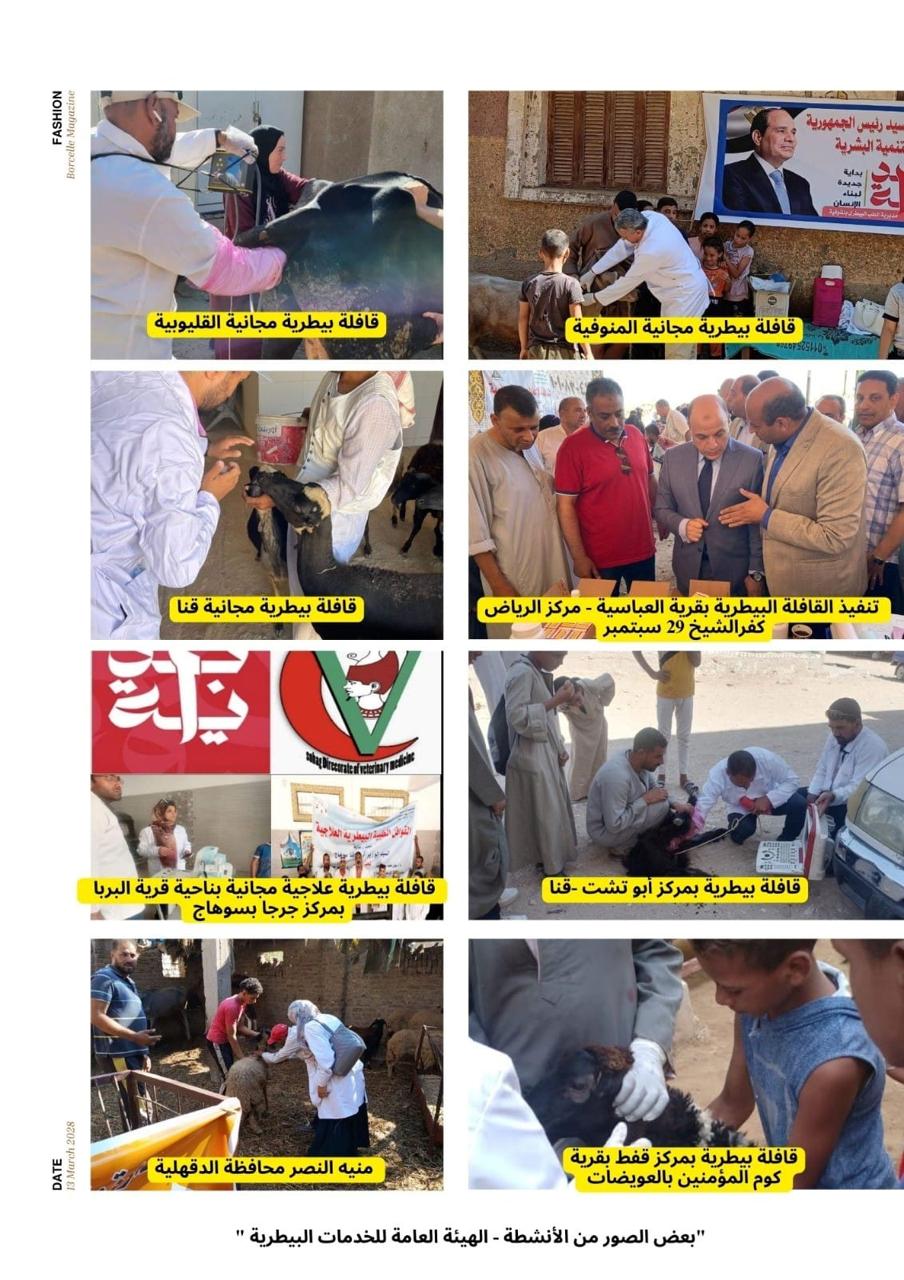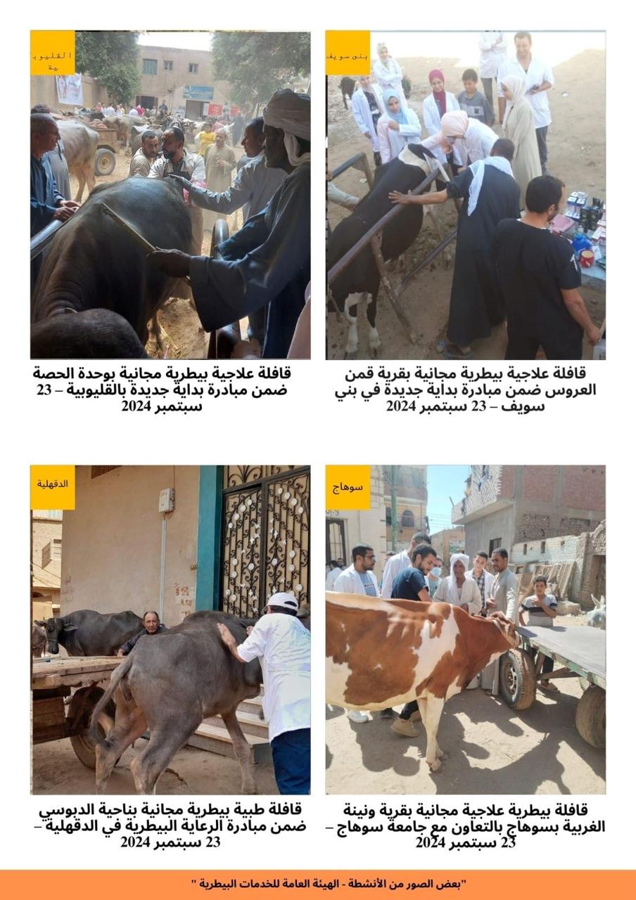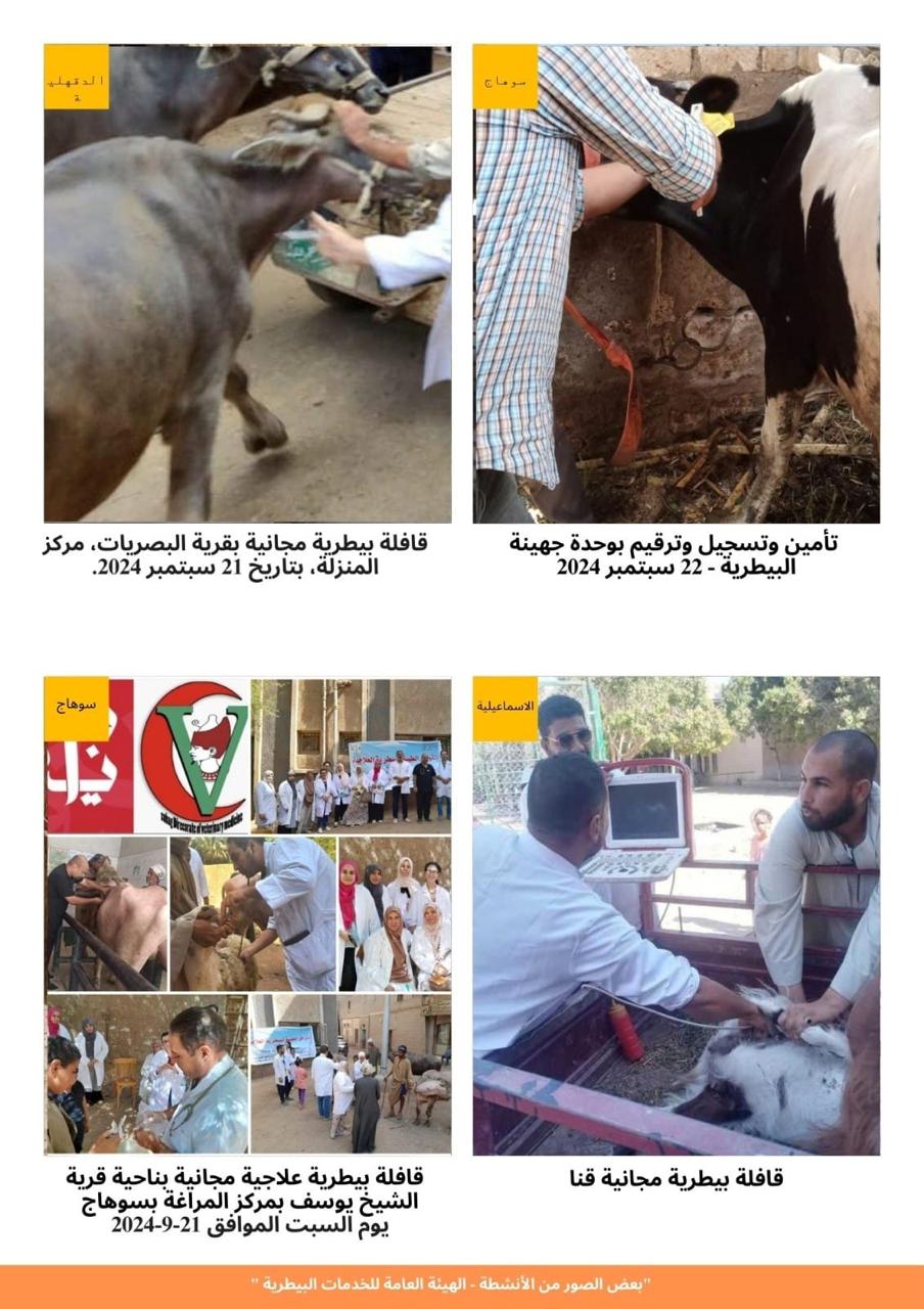 وقال د ممتاز شاهين رئيس الهيئة العامة للخدمات البيطرية انه تم تقديم كافة الخدمات الطبية البيطرية (وقائيةعلاجية) لعدد 776,463 حيوان (أبقار - جاموس - أغنام - ماعز - جمال - خيول - دواب بأعمار مختلفة)، من خلال 259 قافلة و107 حملة تحصينيه تم تنفيذها في جميع محافظات الجمهورية خلال شهر سبتمبر2024.