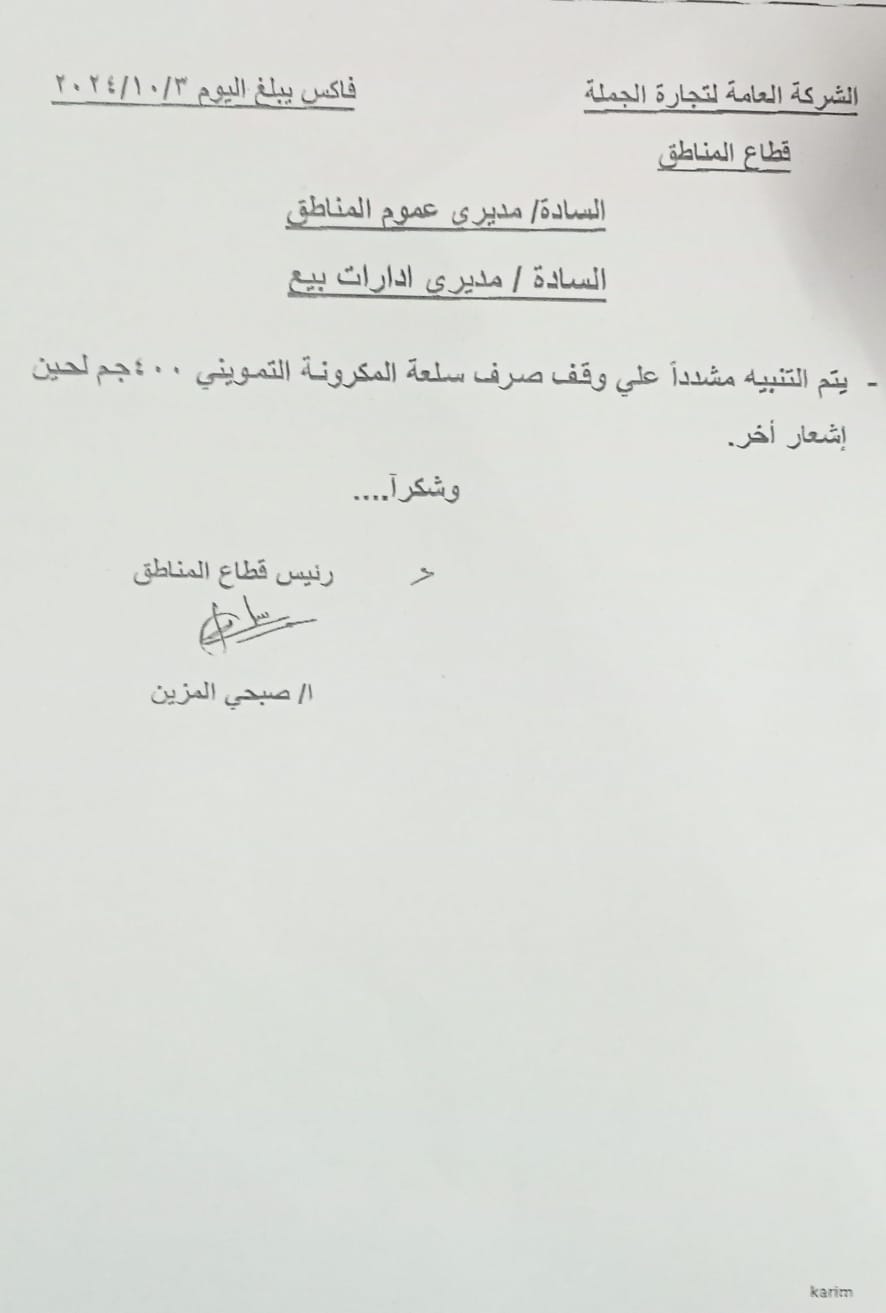 أصدرت الشركة العامة لتجارة الجملة، التابعة لوزارة التموين والتجارة الداخلية، منشورًا، تم توزيعه على الأفرع والمديريات التموينية كافة، يتضمن تنبيهًا مشددًا بعدم صرف المكرونة التمونيية ال 400 جرام.
