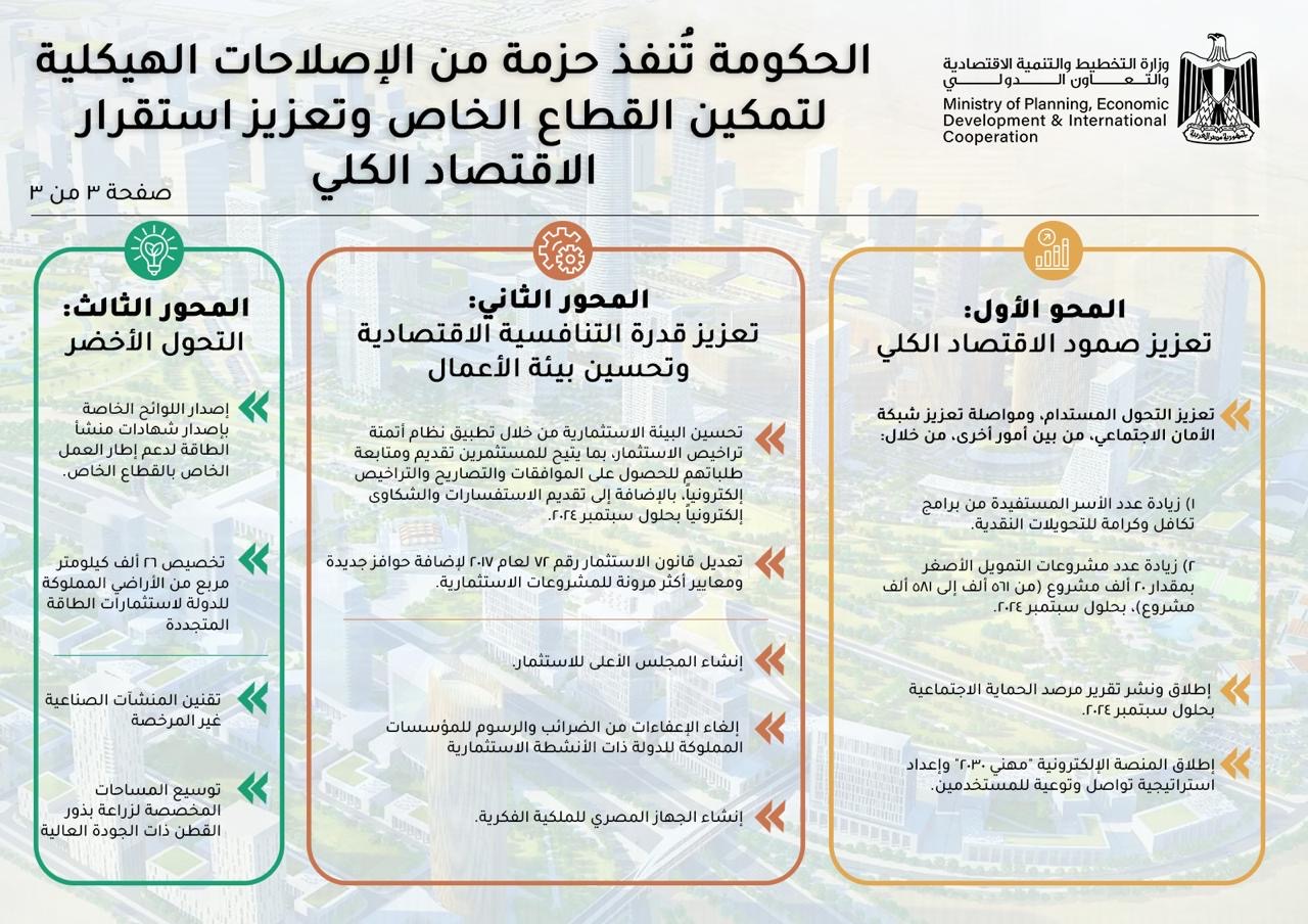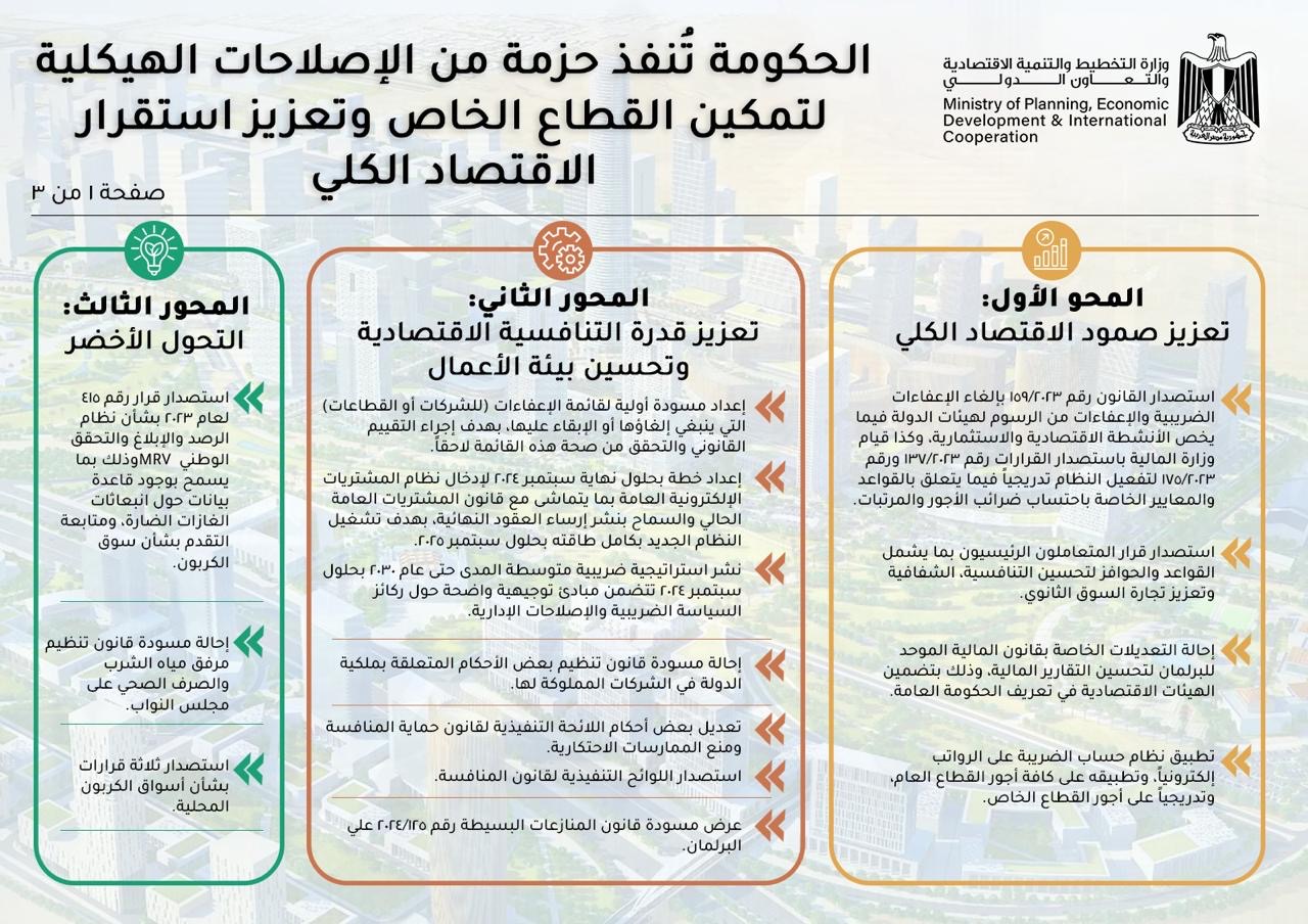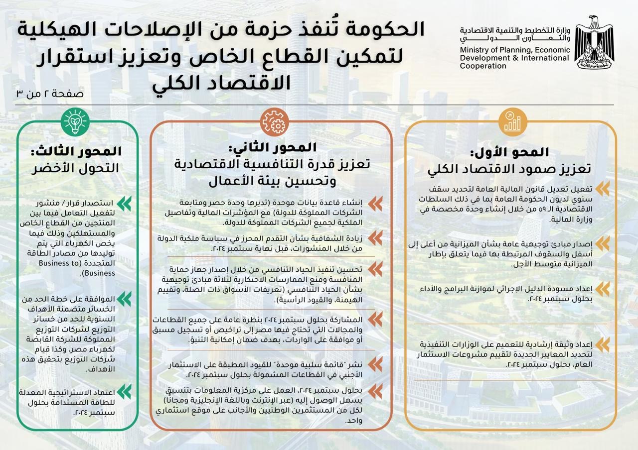 وتسعى الحكومة في إطار برنامجها الجديد، على زيادة نسبة مُشاركة القطاع الخاص في الأنشطة الاقتصادية، باعتباره محركًا رئيسيًا للنمو، من أجل استعادة التعافي الاقتصادي، ولذا فقد قامت وزارة التخطيط والتنمية الاقتصادية والتعاون الدولي، بتنفيذ برنامج تمويل سياسات التنمية، مع عدد من الشركاء الدوليين، والذي يتم في إطار توفير تمويلات لدعم الموازنة، من أجل مساندة تنفيذ الإصلاحات الهيكلية بالتعاون مع مختلف الجهات الوطنية.