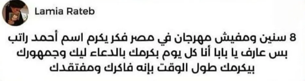 وكتبت لمياء راتب، عبر صفحتها الشخصية على موقع التواصل الاجتماعي الشهير فيسبوك، قائلة: "8 سنين ومفيش مهرجان في مصر فكر يكرم اسم أحمد راتب بس عارف يا بابا أنا كل يوم بكرمك بالدعاء ليك وجمهورك بيكرمك طول الوقت بأنه فاكرك ومفتقدك".