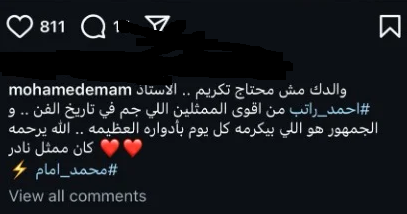 وكتب محمد إمام، عبر حسابه قائلًا: "والدك مش محتاج تكريم الأستاذ أحمد راتب من أقوى الممثلين اللي جم في تاريخ الفن والجمهور هو اللي بيكرمه كل يوم بأعماله العظيمة الله يرحمه كان ممثل نادر".