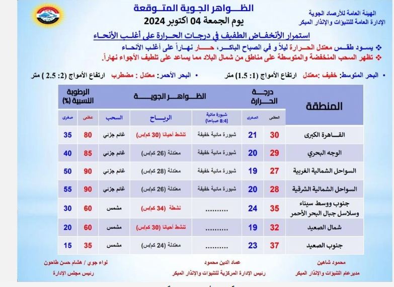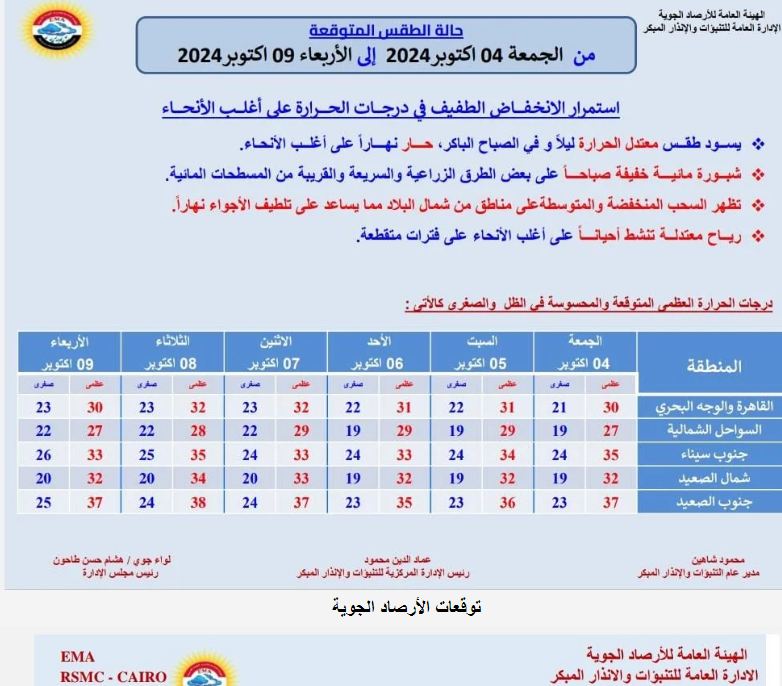 وتوقع خبراء الأرصاد ظهور شبورة مائية صباحًا على بعض الطرق الزراعية والسريعة والقريبة من المسطحات المائية، مع هبوب رياح معتدلة تنشط أحيانا على مناطق من القاهرة الكبرى وجنوب سيناء وشمال الصعيد على فترات متقطعة.