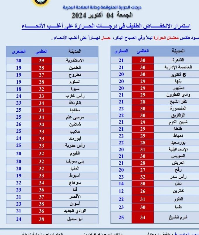 وننشر درجات الحرارة المتوقعة اليوم الجمعة على محافظات ومدن مصر: