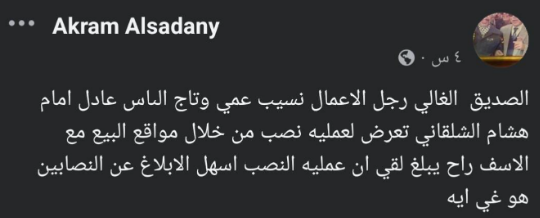 وكتب أكرم السعدني، عبر صفحته قائلًا: "الصديق الغالي رجل الأعمال نسيب عمي وتاج الرأس عادل إمام.. هشام الشلقاني تعرض لعمليه نصب من خلال مواقع البيع مع الأسف، راح يبلغ لقي إن عمليه النصب أسهل من الإبلاغ عن النصابين هو في إيه".