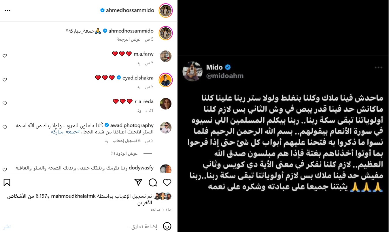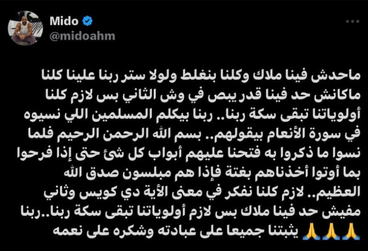 حالة من الجدل والغموض سيطرت على جمهور ومتابعي أحمد حسام ميدو، لاعب نادي الزمالك السابق، بعد كتابته منشورًا مبهمًا عن ارتكاب الأخطاء والمعاصي وستر الله للفضائح، وذلك عبر حسابه الشخصي بمنصة التغريدات المصغرة "إكس"، والذي أعاد نشره على موقع "انستجرام"، معلقًا: “جمعة مباركة”.
