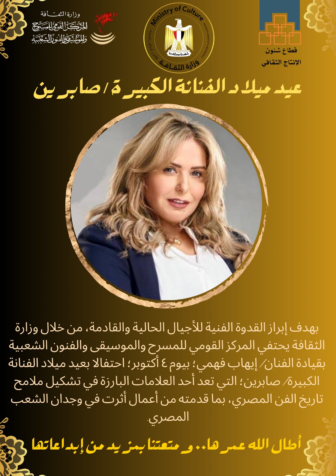 يحتفي المركز القومي للمسرح والموسيقى والفنون الشعبية برئاسة الفنان إيهاب فهمي، اليوم، الجمعة، عيد ميلاد الفنانة صابرين.