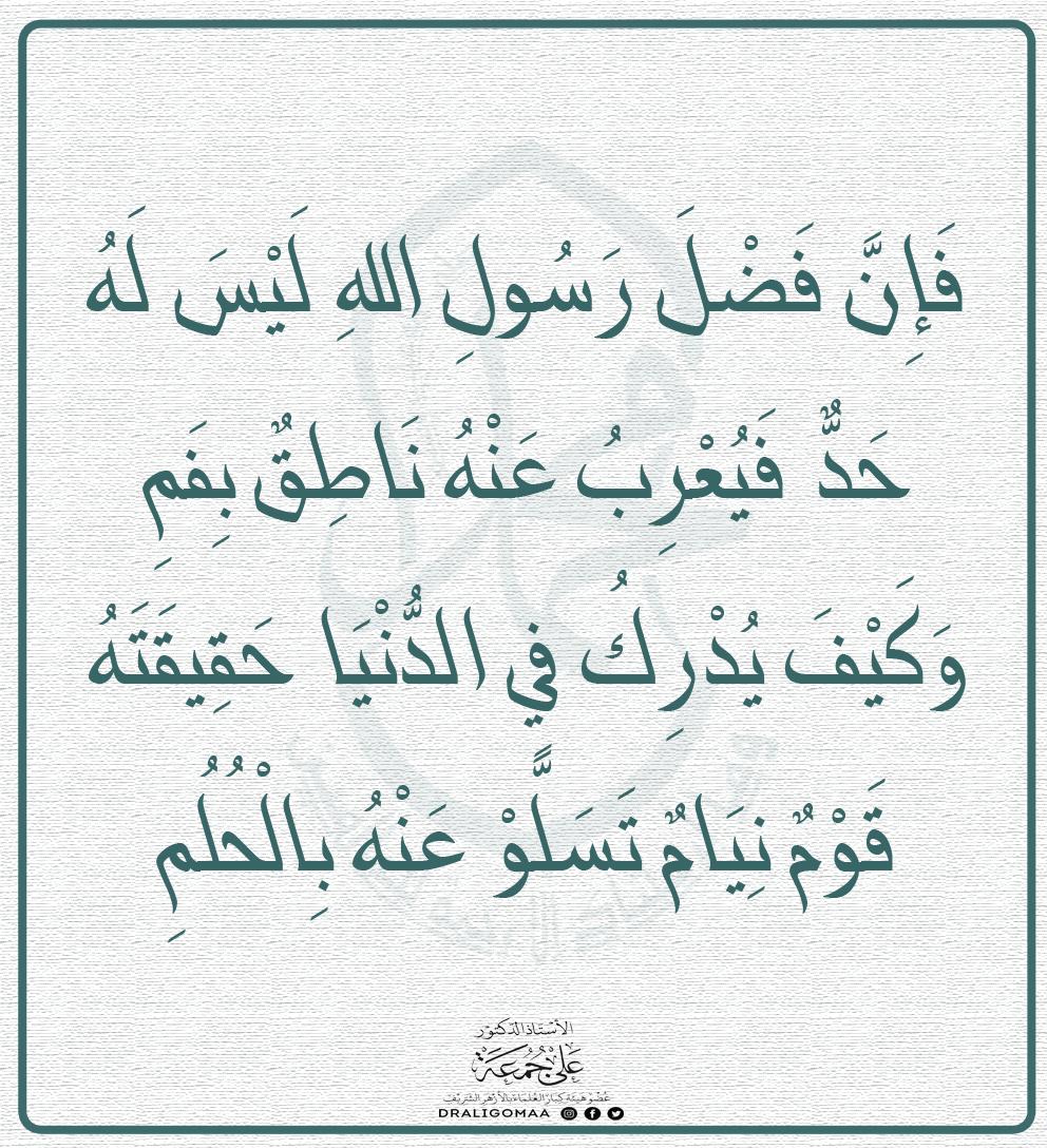 سرد الدكتور علي جمعة، عضو هيئة كبار العلماء، ومفتي الجمهورية السابق بعض الحقائق التي ذكرها الإمام البوصيري في البردة التي يمدح فيها سيدنا رسول الله ﷺ، حين قال فَإِنَّ فَضْلَ رَسُولِ اللهِ لَيْسَ لَهُ، حَدٌّ فَيُعْرِبُ عَنْهُ نَاطِقٌ بِفَمِ، وَكَيْفَ يُدْرِكُ فِي الدُّنْيَا حَقِيقَتَهُ ، قَوْمٌ نِيَامٌ تَسَلَّوْ عَنْهُ بِالْحُلُمِ.