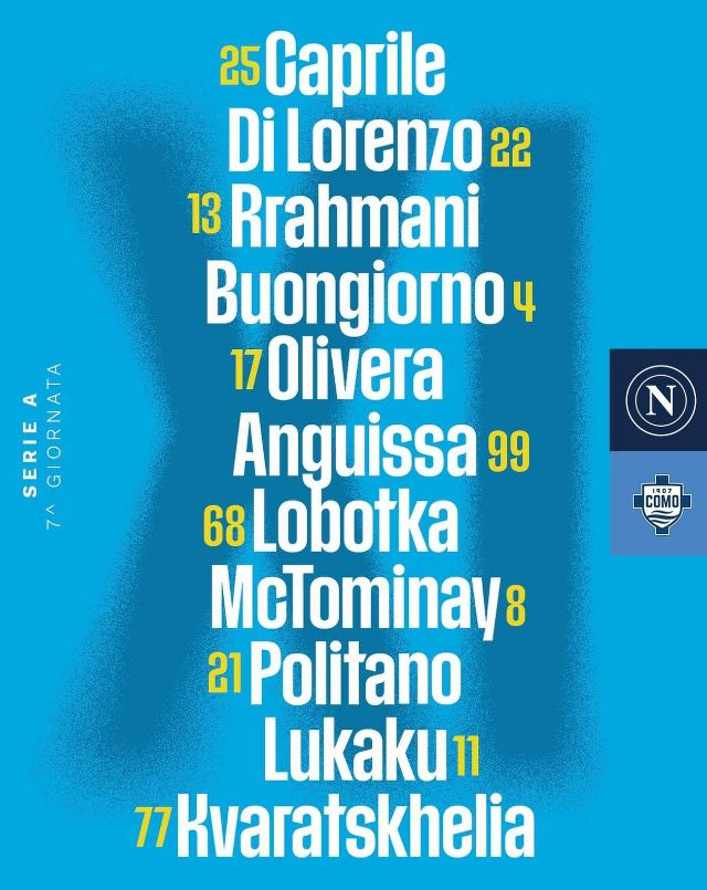 أعلن الإيطالي كونتي مدرب فريق نابولي عن تشكيل فريقه في مباراة كومو المقرر لها اليوم على ملعب دييجو أرماندو مارادونا في الجولة السابعة من الدوري الإيطالي.