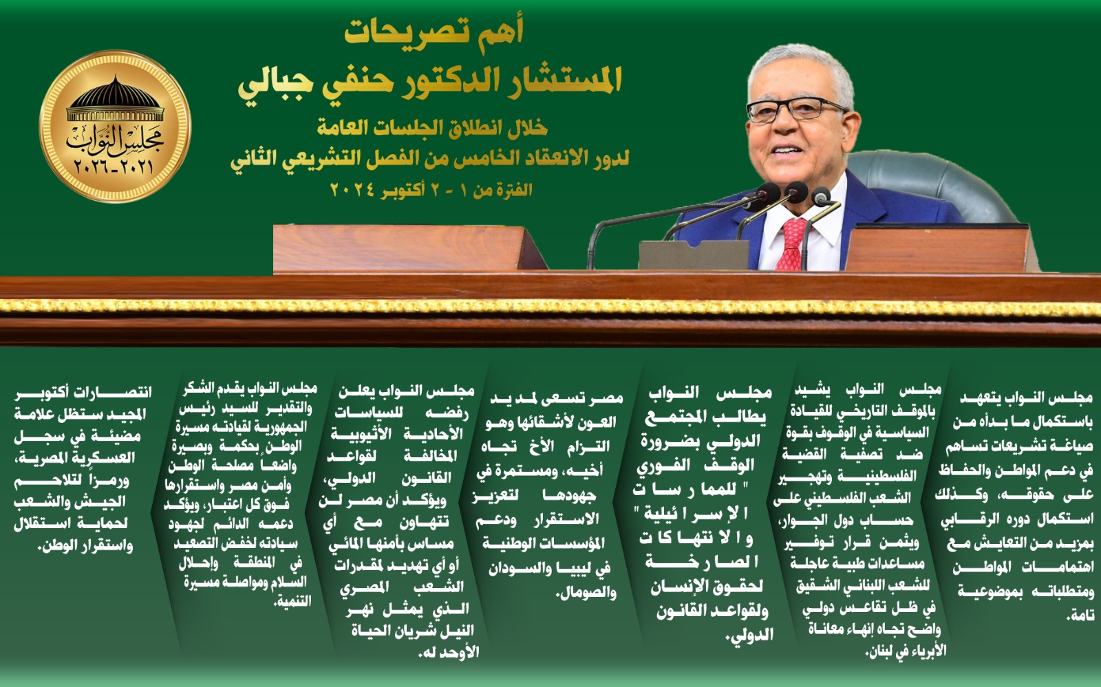 - مجلس النواب يشيد بالموقف التاريخي للقيادة السياسية في الوقوف بقوة ضد تصفية القضية الفلسطينية وتهجير الشعب الفلسطيني على حساب دول الجوار، ويثمن قرار توفير مساعدات طبية عاجلة للشعب اللبناني الشقيق في ظل تقاعس دولي واضح تجاه إنهاء معاناة الأبرياء في لبنان.