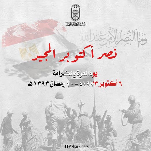 تهنئ هيئة كبار العلماء بالأزهر الشريف الشعب المصري عامة، وقواتنا المسلحة الباسلة خاصة بمناسبة ذكرى انتصارات حرب أكتوبر المجيدة التي سطرت خلالها القوات المسلحة المصريَّة تاريخًا مجيدًا بدماء وشجاعة رجالها المسلحين بالإيمان والقوة والعزم.